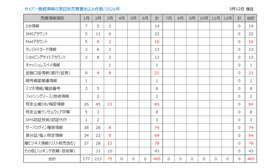● 当ページの情報は中国/ロシア/北朝鮮/その他海外のサイバー闇市場に存在する脅威情報の集計です。