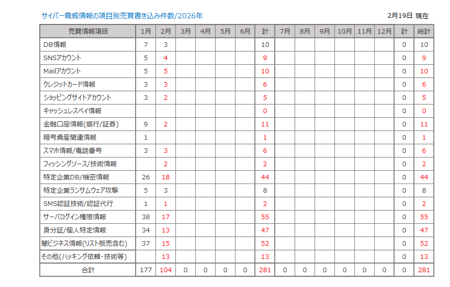 ● 当ページの情報は中国/ロシア/北朝鮮/その他海外のサイバー闇市場に存在する脅威情報の集計です。